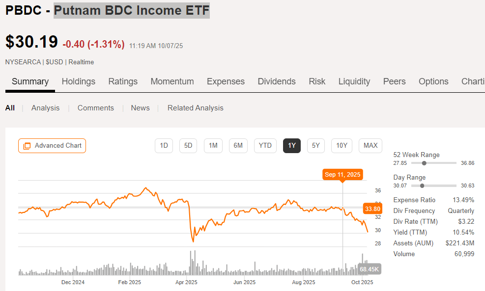 Putnam BDC Income ETF (PBDC) is one of a few ETFs filled with BDCs. Despite only having about $220 million in AUM (assets under management), it still averages more than an article per month. Is it a very interesting ETF? I don’t think so. But I’m bringing it up today because I want to discuss the price movement we’ve seen across the sector. In less than a month we’ve seen the price fall by about 10.7%. It’s not really that bad. The ETF just went ex-dividend. If we adjust for that, as we should, the value dropped about 8.5%. However, that’s still one of the sharpest drops we’ve seen in the last few years outside of April 2025.